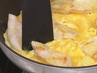 卵がほぼ固まったところで、フライ返しで1切れずつ切り分けて返すのがポイント