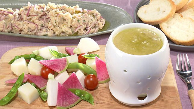 ・じゃが芋:皮をむいて一口大に切り、鍋にヒタヒタの水と塩少々とともに入れ、固めにゆでる。 ・かぶ:茎を1㎝ほど残して葉を落とし、皮をむいて6~8つ割りにする。水につけ、茎の間の汚れを除いて水気をきる。 ・スナップえんどう:筋を除き、小さいフライパンに水少々、塩一つまみとともに入れ、ふたをして強火で2分ほど蒸しゆでにする。水にとって冷まし、半分に裂いて水気をふく。 ・紅芯大根:皮をむき、薄い輪切りにし、6等分に切る。 ・ミニトマト:ヘタを除く。