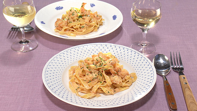 クリームソースがよくからむ、平打ちのフェットチーネを使うのがおすすめ!