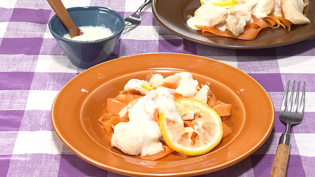 にんじんを長い薄切りにするときはピーラーを使うと簡単です。スライサーを使ってもOK!
