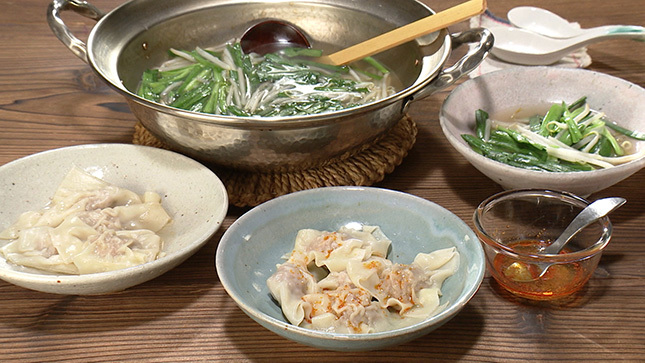 残ったワンタンの皮は、細く切って野菜と一緒に煮て食べて。めんの代わりになります。一度に入れると皮同士がくっついてしまうので、パラパラと1枚ずつ入れるのがコツです。