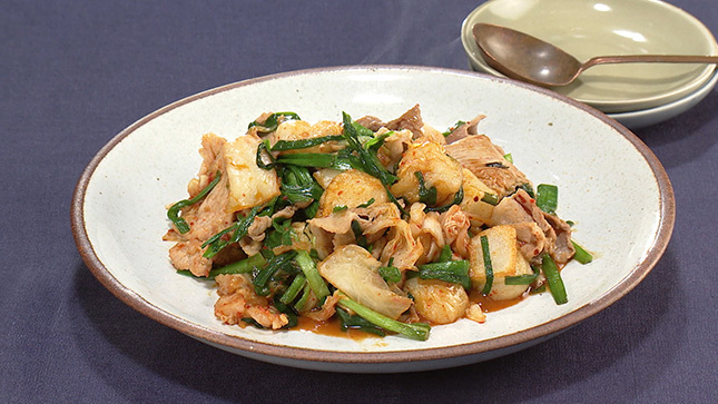 定番の豚キムチ炒めに、もちを加えることでボリュームアップします