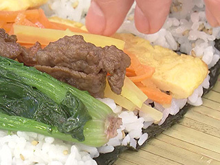 焼きのりにごはんをのせる時は、手前1cm、向こう2cmほどあけるときれいに巻けます