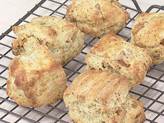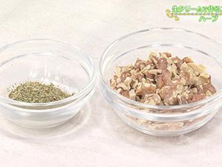 材料・作り方(6個分) 「生クリームで作る スコーン」と基本の材料は同じで、作り方(1)でイタリアンハーブミックス小さじ2を加え、作り方(2)でそぼろ状にしたら、くるみ30gを粗く刻んで加え、同様に生地を作る。作り方(5)で2.5〜3㎝厚さの長方形に整え、6等分に四角く切り、同様に焼く。