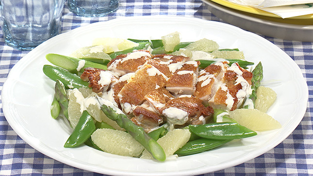 スナップえんどうとアスパラは、ゆで過ぎないように注意して、食感を残しましょう