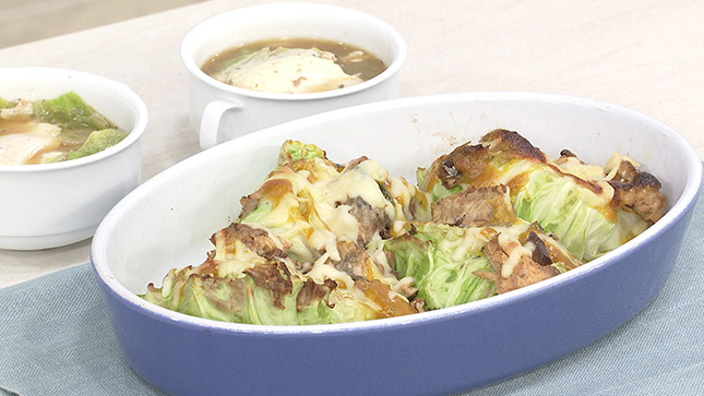フライパンで焼き色をつけてからオーブンで焼くことで、キャベツに火が入りすぎるのを防ぎます