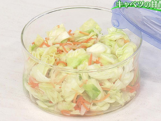 材料・作り方(作りやすい分量) 1:キャベツ2/3個(300g)はざく切り、にんじん1/3本(60g)はせん切り、玉ねぎ1/4個(50g)は縦薄切りにする。ボウルに入れて塩小さじ1をふり、全体を軽くもみ、重石(皿3枚くらい)をして1時間ほどおく。 2:(1)の水気を軽くきる(絞らなくてよい)。酢、砂糖各大さじ2、油大さじ1を混ぜ合わせて加え、全体をあえる。保存容器に入れ、冷蔵で3~4日保存可能。 余りがちなキャベツは、鮮度のよいうちに甘酢漬けにすれば、おいしいまま保存が可能に。