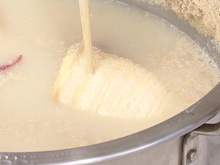 〈材料〉 新たけのこ 1~2本(約1.2kg) 米ぬか 1カップ 赤唐辛子 2本 〈ゆで方〉 1:たけのこは根元を少し切り落とし、穂先は斜めに切り落とし、皮の部分に縦に1本切り込みを入れ、皮をすべてむく。大きければ縦半分に切って皮をむく。 2:大きめの鍋にたけのこ、水3ℓ、米ぬか、赤唐辛子を入れて強火にかける。フツフツとしてきたら落としぶたをし、さらに鍋ぶたを少しずらしてのせ、弱火で1時間ほどゆでる。 3:たけのこの根元に菜箸がスッと通ったら火を止め、ゆで汁につけたまま冷ます。使うときに洗って米ぬかを落とし、根元を菜箸できれいにそいで水気をふく。 ●保存する場合は、保存容器にゆで汁ごと入れる。冷蔵で1~2日保存可能。3日以上保存する場合は、洗って米ぬかを落とし、保存容器に入れてかぶるくらいの水を注ぎ、毎日水をかえる。冷蔵で5日ほど保存可能。