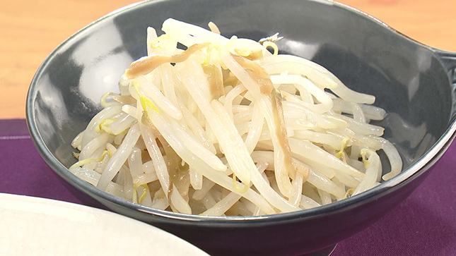 もやしは電子レンジにかけすぎると歯ざわりが悪くなるので、余熱を利用してシャキッと仕上げます