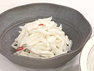 材料・作り方(作りやすい分量) 1:かぶの皮120gは細切りにし、塩小さじ1/2をまぶして10分ほどおき、出てきた水気を絞る。 2:保存容器に酢、砂糖各大さじ2、塩小さじ1/2を入れてよく混ぜ合わせ、(1)を加えてさっと混ぜる。だし昆布3㎝角、赤唐辛子の小口切り少々を加え、冷蔵庫に一晩おく。 あちゃら漬けは、ポルトガル語で漬けものを意味する「アチャール」が語源といわれる甘酢漬けで、唐辛子の辛みを効かせるのが特徴。季節の野菜で作りますが、ここではかぶの皮を利用します。