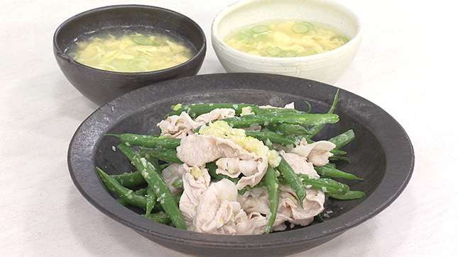 材料 (2人分) 長ねぎ(青い部分) 5㎝ 卵 1個 さやいんげんと豚肉のゆで汁 全量 (上記参照) 作り方 1:長ねぎは薄い小口切りにする。卵は溶きほぐす。 2:ゆで汁に水1/2カップを足して火にかける。煮立ったらアクを除き、溶き卵を細くまわし入れ、長ねぎを加えて火を止める。 いんげんの香り、豚肉のうまみが出たゆで汁は具材を加えてスープに活用します。塩味がついているので味つけも不要です。