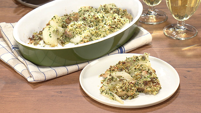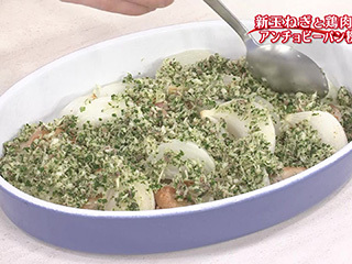 パン粉にオリーブ油を吸わせるように、よく混ぜておくと、焼き色が均一になります