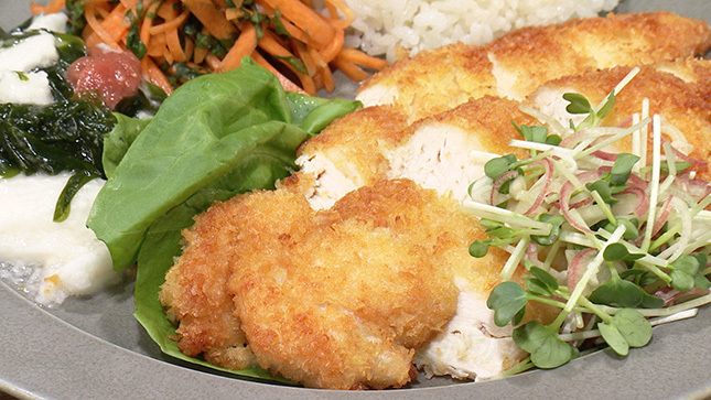 ●副菜の「たたき長芋とわかめの梅酢あえ」と「にんじんの青じそ漬け」を先に作り、カツレツは最後に作って揚げたてを盛ります。 ●副菜の2品は器の奥に盛り、ちぎったサラダ菜を仕切りにして、カツレツを盛れば、カツレツに汁がしみません。 ●カツレツは、食べやすい大きさに切って盛り、手前に薬味を添えます。