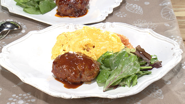 ●炊飯器で炊く「ケチャップライス」をはじめに準備します。 ●次に主菜の「ハンバーグ」を作り、蒸し焼きにしている間に、「ベビーリーフのサラダ」を作ります。 ●「ケチャップライス」が炊き上がったら、器の手前に盛り、それから「スクランブルエッグ」を1人分ずつ作って上にのせます。 ●「ハンバーグ」と「ベビーリーフのサラダ」は、器の奥にそれぞれ盛ります。