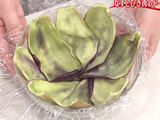 なすの皮は、皮目を外側にして少しずつ重ねて放射状に敷きつめる。