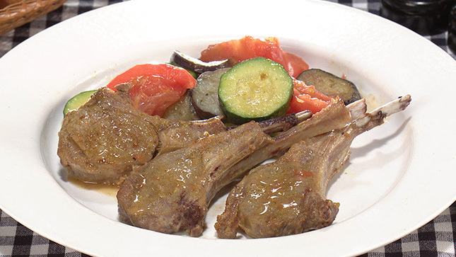 野菜の上にラムチョップをのせて蒸し焼きにすることで、ラム肉のうまみが野菜にもしみわたります