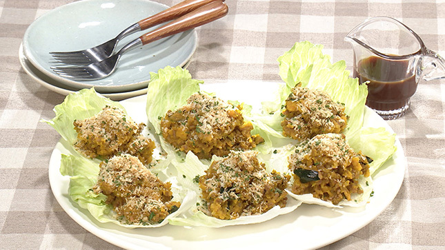油で揚げない代わりに、仕上げにカリカリのパン粉をのせて、コロッケの食感を再現します