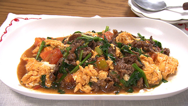 トマトを炒め、角が少しくずれてきたら、にらと合わせ調味料を加えるタイミングです