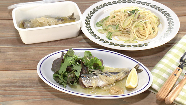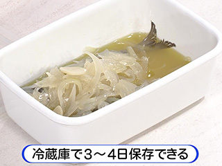 保存する場合はよく冷まし、いわしを保存容器に入れ、上に野菜をのせ、煮汁をかける。冷蔵で3~4日保存可能。オリーブ油が固まるので、食べるときは室温にもどすか、軽く温める。