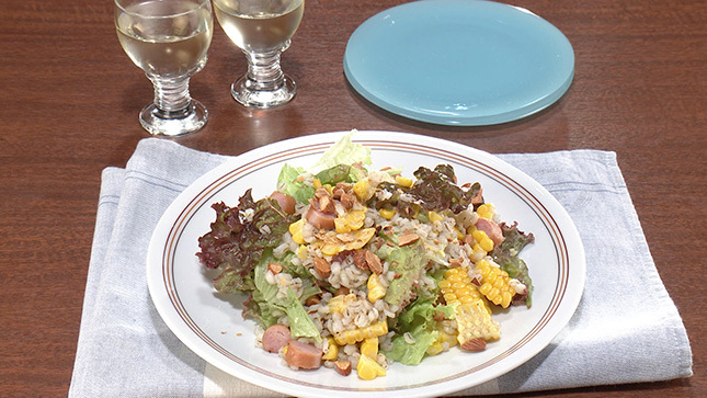 野菜に押し麦やナッツを合わせることで、歯ごたえが楽しいサラダになります