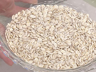 精白した大麦の外皮を除いて蒸し、ローラーで平らにしたもので、食物繊維やミネラルを多く含む。サラダにはゆでて使う。