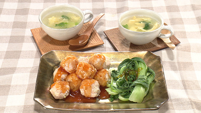 材料・作り方(2人分) 1:鍋にボイルチキンミートボールのゆで汁全量(約2+1/4カップ)、チンゲンサイの小さい葉約20gを食べやすく切って入れ、中火で2~3分煮る。 2:塩小さじ1/4、こしょう少々を加え、強めの中火で煮立てる。溶き卵1/2個分をまわし入れ、ふんわりと浮いてきたら、火を止める。器に盛り、炒り白ごま小さじ1/4を指でひねってふる。 肉のうまみの出たゆで汁と、残りのチンゲンサイと溶き卵を使って、もう1品おいしいスープが作れます。