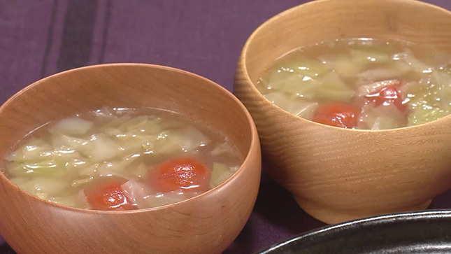 スープのキャベツはじっくりと蒸し炒めにすることで、甘みとうまみを引き出してください