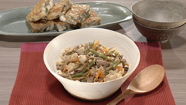 材料・作り方(作りやすい分量) 1:ボウルに卵3個を溶きほぐし、炒り豆腐1/3量(約200g)、塩少々を加えて混ぜる。 2:卵焼き器(12.5×17㎝)に油大さじ1を熱し、(1)を入れて半熟状になるまで混ぜ、ふたをして焼く。底面が固まり、表面が少し固まったら小さいまな板などに返してとり出し、滑らせて卵焼き器に戻し、弱火にして4分焼く。粗熱がとれたら、食べやすい大きさに切り分ける。 多めにできた炒り豆腐は、溶き卵に混ぜて焼き、ぎせい豆腐にリメークしても。早めに食べきりましょう。