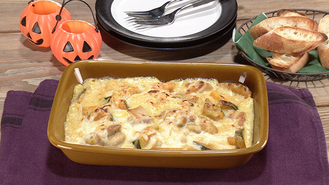 ホワイトソースを別に作らないので、手軽にできるグラタンです。ハロウィーンにぜひ、お試しください!