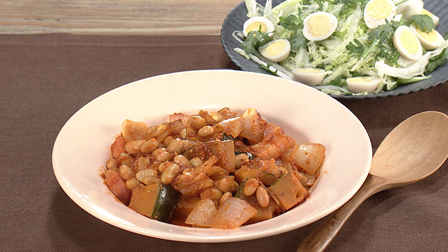 ベーコン、かぼちゃ、大豆のケチャップ煮
