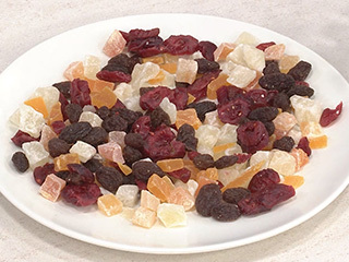 今回使用したものは、レーズン、パイナップル、パパイヤ、クランベリー、マンゴーの5種類を小さく角切りにしたもの。フルーツは好みのものでよく、大きいものなら、やわらかくしてから小さく刻んで使用する。