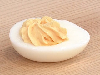 白身のくぼみに、ペースト状の卵黄をこんもりと絞り出す。