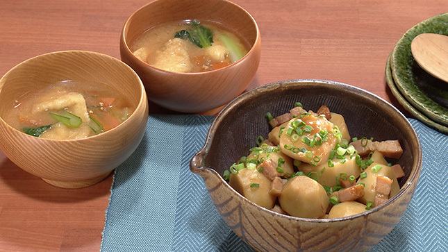 ベーコンをごま油で炒めてから里芋と煮ることで、こっくりとしたうまみをプラスします