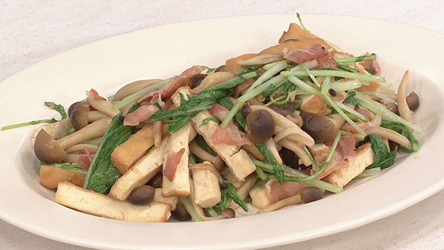水菜は最後に加えて、歯ごたえを残しましょう。炒めすぎないのがポイントです