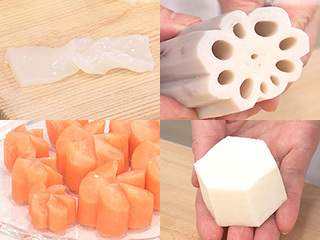 ▼手綱こんにゃく 1:縦長におき、真ん中より少し下に1㎝ほどの切り込みを入れる。 2:長いほうの端を切り込みにくぐらせる。 ▼花れんこん 1:れんこんの節穴と節穴の間に、縦に1本切り込みを入れる。 2:(1)の切り込みに向け、両側から花びらの形になるように斜めに切りとる。 ▼ねじり梅 1:大、小の梅型で抜く。 2:花弁と花弁の間に包丁の刃元を当て、中心に向けて5本の切り込みを入れる。 3:花弁の頂点から切り込みに向けて斜めにそぎとる(片面だけでよい)。 ▼長芋の六方むき 1:切り口を下にしておき、六角形になるように皮を縦に切り落とす。