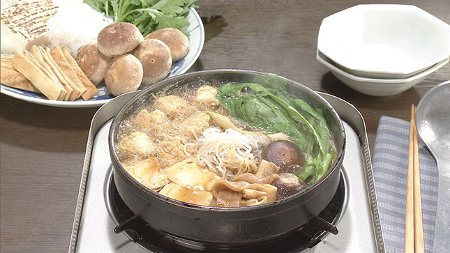 締めは焼きもちがおすすめ。半分に切って焼いたもちを、残った鍋汁で煮て、召し上がれ!