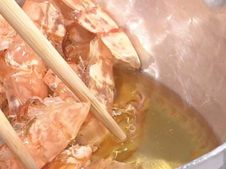 材料・作り方(約1/2カップ分) ① えびの殻(えび150g分)はよく洗い、水気をふく。鍋に入れ、香ばしくなるまで弱火で10分ほど空炒りし、火を止める。 ② 長ねぎ(青い部分)1本分は長さを3等分に切り、しょうがの薄切り1枚、油1/2カップとともに(1)に加え、弱火にかけて殻がカリカリになるまで10分ほど煮る。 ③ 熱いうちにこし、清潔なびんに入れて保存する。常温で1週間ほど保存できるが、香りがよいうちに早めに使いきる。 うまみがあるえびの殻を空炒りし、臭みをとって香ばしさを出してオイルで煮ます。こした「えびオイル」は、香り油として炒めものやチャーハンの仕上げにまわしかけたり、ラーメンにかけたりしても美味。