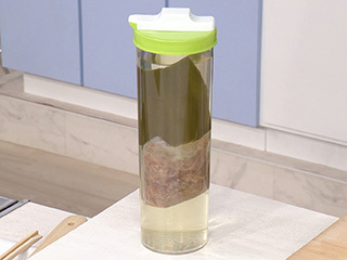 保存容器に水1ℓとだし昆布5gを入れ、さばや宗田がつおなどの混合の削り節10gをだしパックに入れて加え、冷蔵庫で3時間以上おく(一晩おいたらだしパックは除く。削り節はサラダに使う。下記参照)。冷蔵で2~3日保存可能。