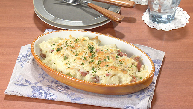炒めた野菜に小麦粉をふってソースを作ると、ダマになりにくく、手軽にグラタンが楽しめます