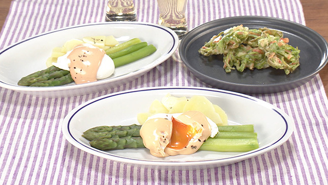 材料・作り方(2人分) ① アスパラガスの根元と皮(60g)は、根元は5㎜幅の小口切りにし、皮は食べやすい長さに切る。 ② ボウルに(1)、桜えび(乾燥)大さじ1を入れ、小麦粉大さじ1をふって菜箸で混ぜて全体にまぶす。 ③ 小さいボウルに小麦粉、水各大さじ2を入れてよく混ぜ、(2)のボウルに加えて混ぜる。 ④ フライパンに油を1㎝深さに入れて170℃に熱し、(3)を1/4量ずつ落とし入れる。表面が固まってきたら、菜箸でときどき上下を返し、カラッと揚げる。油をきって塩少々をふり、器に盛る。 捨ててしまいがちな、アスパラガスの根元の固い部分と皮も、桜えびと合わせてかき揚げにすれば、立派なおかずになります。