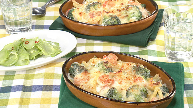 マカロニは早ゆでタイプのものを使い、別ゆでせずにホワイトソースと一緒に煮ることで、手軽に作ります