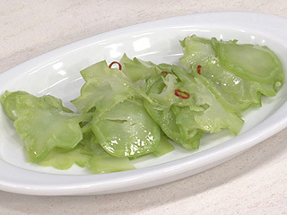 材料・作り方(2~3人分) ① ブロッコリーの茎1個分(100g)はスライサーで薄い輪切りにする。耐熱ボウルに入れ、ラップをして電子レンジ(600W)に2分30秒かけ、粗熱をとる。 ② 塩、砂糖各小さじ1/4、にんにくのみじん切り、赤唐辛子の小口切り各少々、ごま油小さじ1を加えて混ぜる。すぐに食べられ、冷蔵で3~4日保存可能。 ブロッコリーの茎は、皮をむいてからゆでて使うことが多いですが、皮を厚くむくので、意外と捨てる部分がたくさん。皮をむかずに繊維を断つようにスライサーで薄い輪切りにすると、皮も食べられて無駄が出ません。電子レンジにさっとかけ、あえものにすると味わい、歯ごたえともに味つきザーサイのようになります。