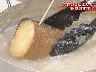 ① 新たけのこ1~2本(700g)は穂先を斜めに切り落とし、1㎝深さほどの切り込みを縦に1本入れる。 ② 大きめの鍋にたけのこがかぶるくらいの水、米ぬか大さじ4、赤唐辛子1本を入れ、(1)を加えて火にかける。沸騰したら弱火にし、ふたはしないで1時間ほどゆでる。たけのこに常に湯がかぶるように、途中で水を足しながらゆでる。 ③ たけのこの根元に竹串を刺し、スッと通ればゆで上がり。火を止め、ゆで汁につけたまま冷めるまでおく。 ④ たけのこはよく水洗いして米ぬかを落とし、切り込みから皮をむく。やわらかい姫皮はとりおき、汁ものなどに使う。根元の固い部分は切り落とし、茶色い部分は包丁で削りとる。 ●保存する場合は、保存容器に入れ、かぶるくらいの水を加えて冷蔵で保存。毎日水をとりかえて3~4日保存可能。