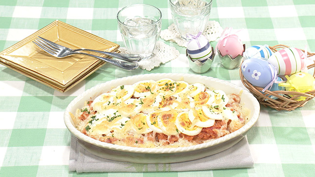 輪切りのゆで卵を並べて焼き上げれば、イースターにぴったりの一品に!