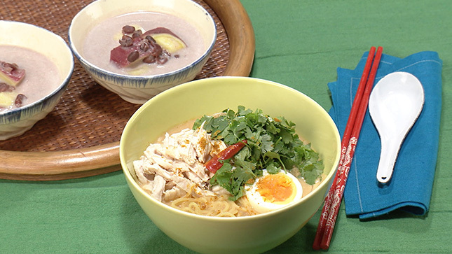 鶏ささ身のゆで汁や干しえびのもどし汁も使い、色々なうまみをプラスしたスープを作りましょう