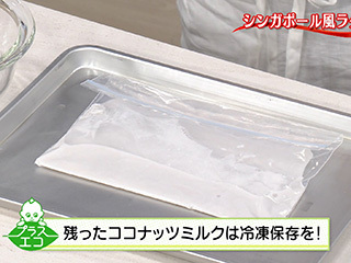 残ったココナッツミルクは、密閉保存袋に入れて、平らにして冷凍保存します。使うときは凍ったまま割って加えればOK。カレーなどの煮込みのほか、ココナッツ汁粉などのデザートにも使えます。1か月を目安に使いきります。
