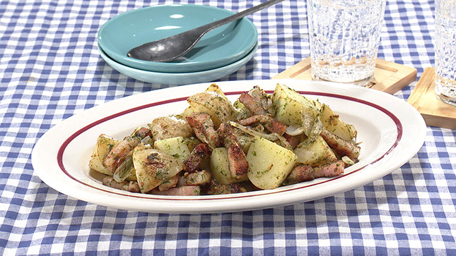 ベーコンを焼き色がつくまで炒め、うまみの出た脂でじゃが芋を炒めるのがポイント!