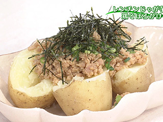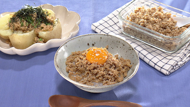 材料・作り方(2人分) ① 新じゃが芋2個(300g)はよく洗い、皮つきのまま1個ずつラップで包み、電子レンジ(600W)に7分かける。半分に割り、器に盛る。 ② 電子レンジで軽く温めた「鶏そぼろ」(上記参照)100gをかけ、万能ねぎの小口切り1本分、刻みのり2gをのせる。 鶏そぼろは、多めに作って常備しておくと、日々のおかず作りに活躍します。丼のほか、お弁当や卵焼きの具、豆腐にかけるなど、いろいろな食べ方が楽しめます。