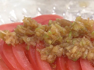 材料・作り方(2人分) トマト1/2個(100g)は5㎜幅に切る。器に盛り、香味だれ(上記参照)大さじ1をかける。