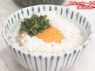 材料・作り方(1人分) ごはん(温かいもの)150gに、卵黄1個分をのせ、にらだれ大さじ1をかけ、混ぜながら食べる。